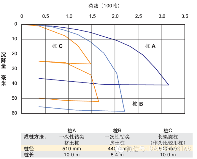 由于擠土樁擠密周邊土體的效應(yīng),樁的側(cè)摩擦力得到顯著提升,從而增加了單樁的承載力、減少樁的沉降量,增加安全系數(shù)。在滿足同等的設(shè)計荷載條件下,采用擠土樁工藝成樁,可以對樁長、樁徑進(jìn)行優(yōu)化,從而減少工程造價。如圖1,寶峨公司在工地現(xiàn)場采用三種成樁方式施工,最終所得到的樁的載荷—沉降曲線對比數(shù)據(jù)。